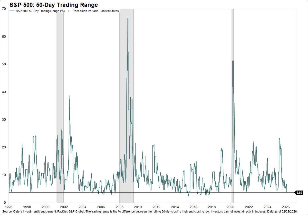 The S&P 500 has been confined to a tight range over the past 50 trading days, its narrowest stretch since September 2017.