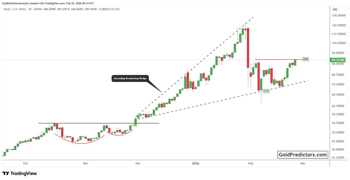 Silver is carving out a short-term base with confirmation being a decisive break above $90.