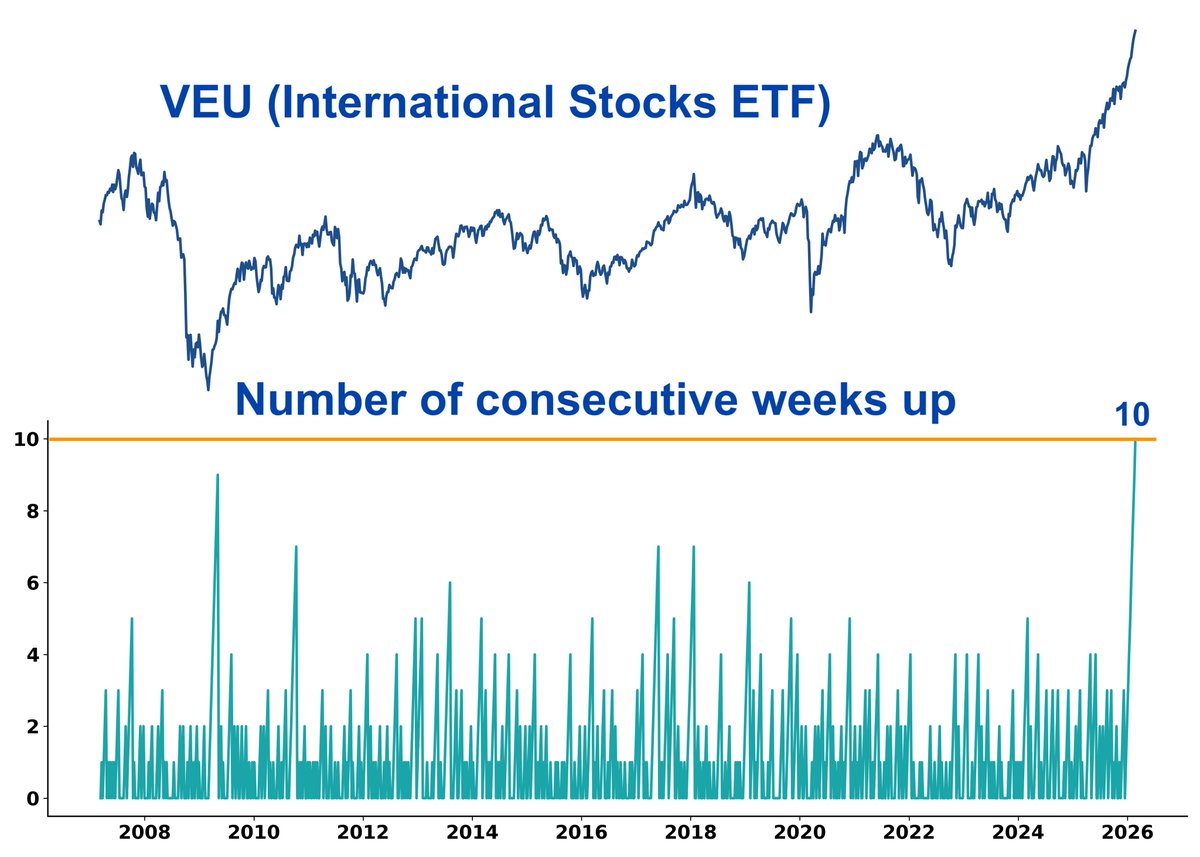 International equities have rallied for 10 consecutive weeks, the longest streak in history.