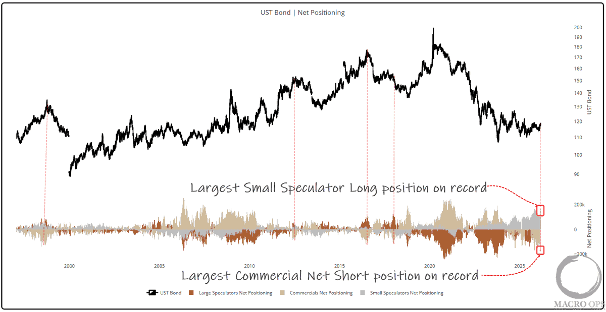 Small Speculator positioning in long bonds is at its highest level on record, while Commercials are holding record short exposure.