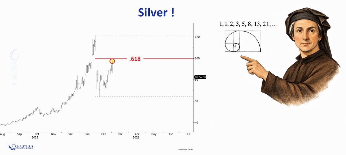 Silver is rolling over at the 61.8% Fibonacci retracement.