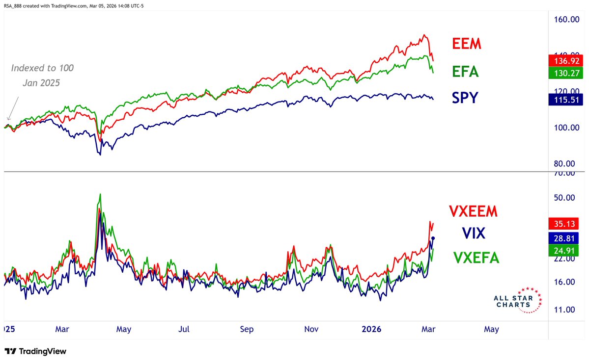 Volatility spikes across SPY, EEM, and EFA have reached their largest levels since the April lows.
