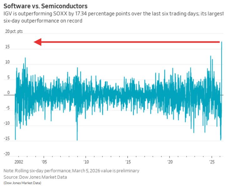 Over the last six sessions, software has outperformed semiconductors by 17.3%, the largest spread on record.