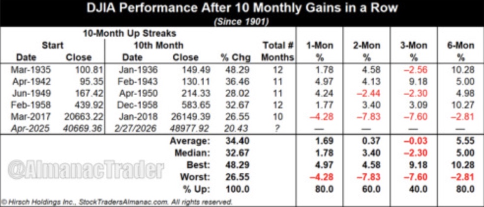After similar streaks since 1901, the index moved higher the following month 80% of the time with an average gain of 1.69%.