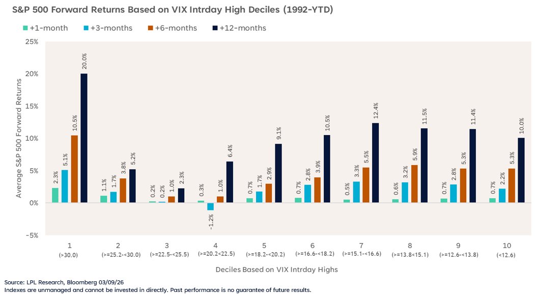 The VIX spiked to 35 overnight, and similar readings have coincided with above-average forward S&P 500 returns.