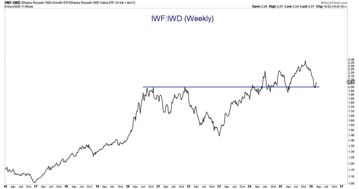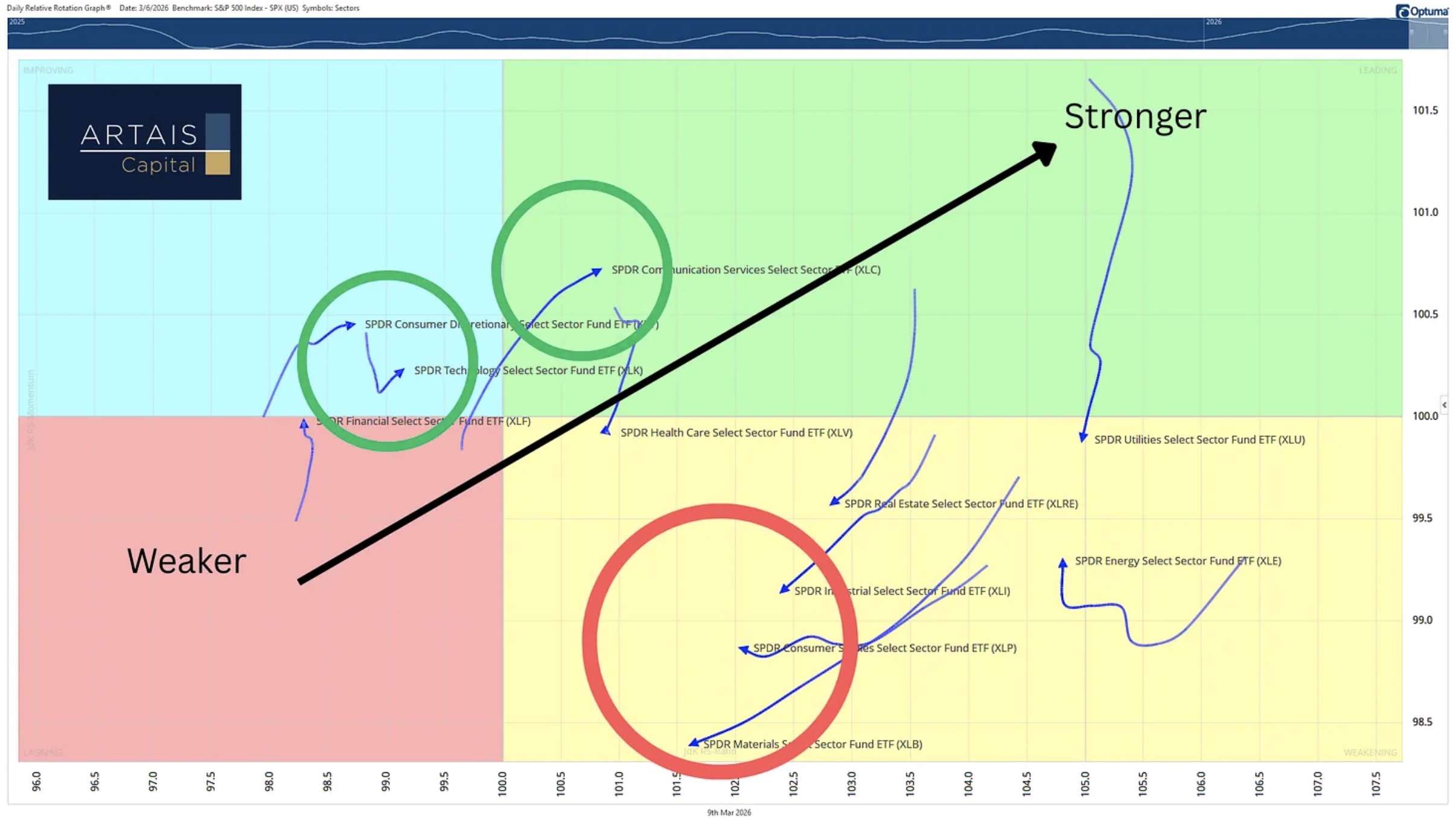 The Relative Rotation Graph shows rotation favoring Technology and Communications, while value sectors like Consumer Staples and Materials rotate toward weakness.