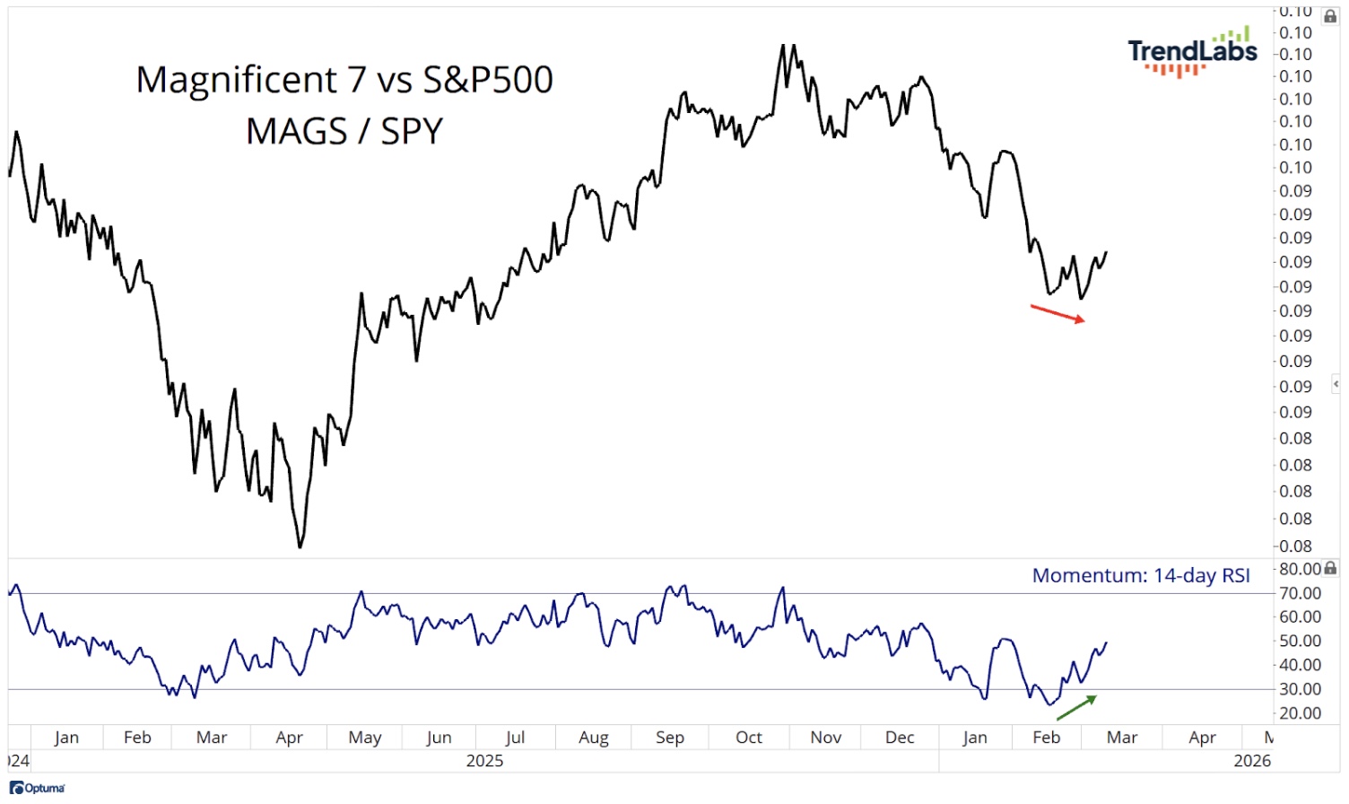 The Mag Seven relative to the S&P 500 made lower lows into the end of February, but momentum held a higher low β a classic bullish divergence.
