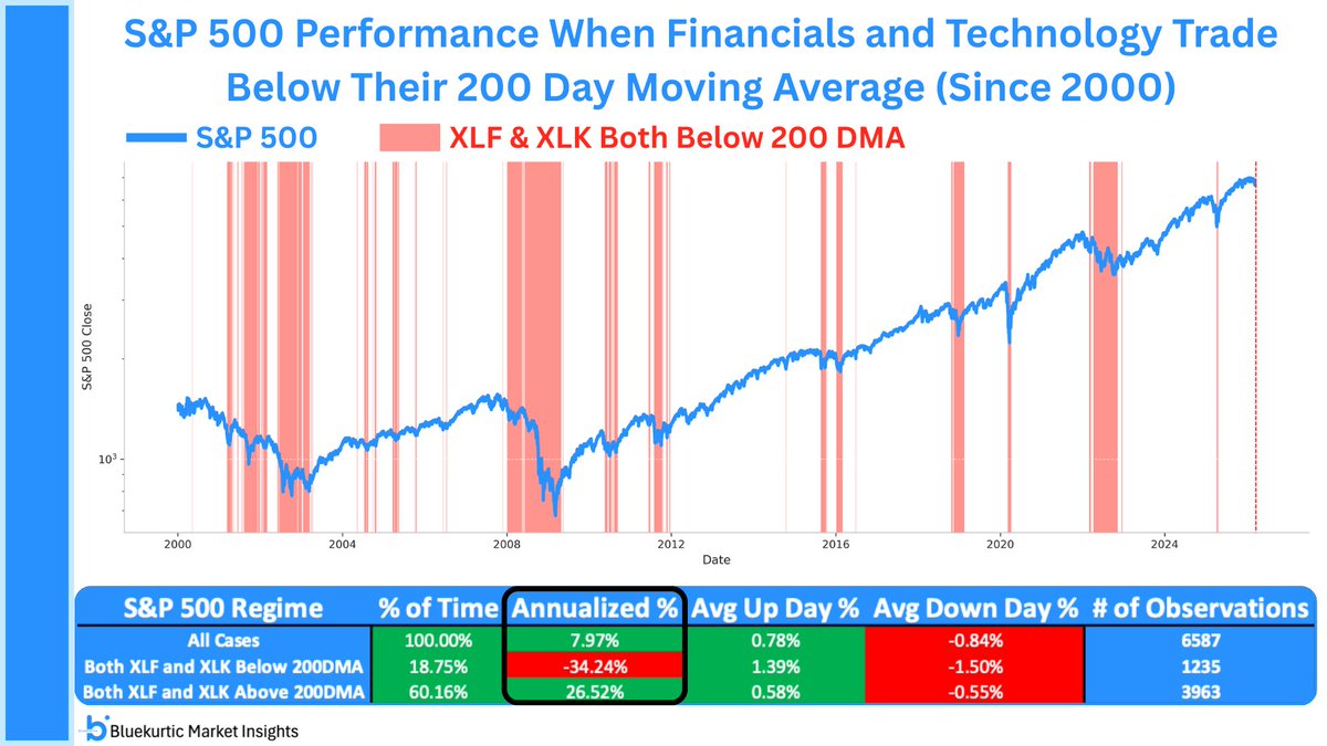 When both sectors trade below their 200 day moving averages, the index has historically suffered steep drawdowns.