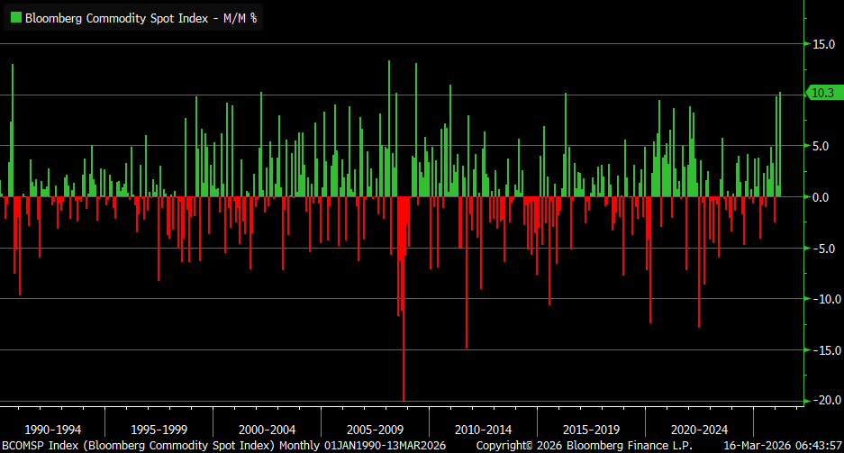 Halfway into March, The Bloomberg Commodity Spot Index is on track for its best month since December 2010.