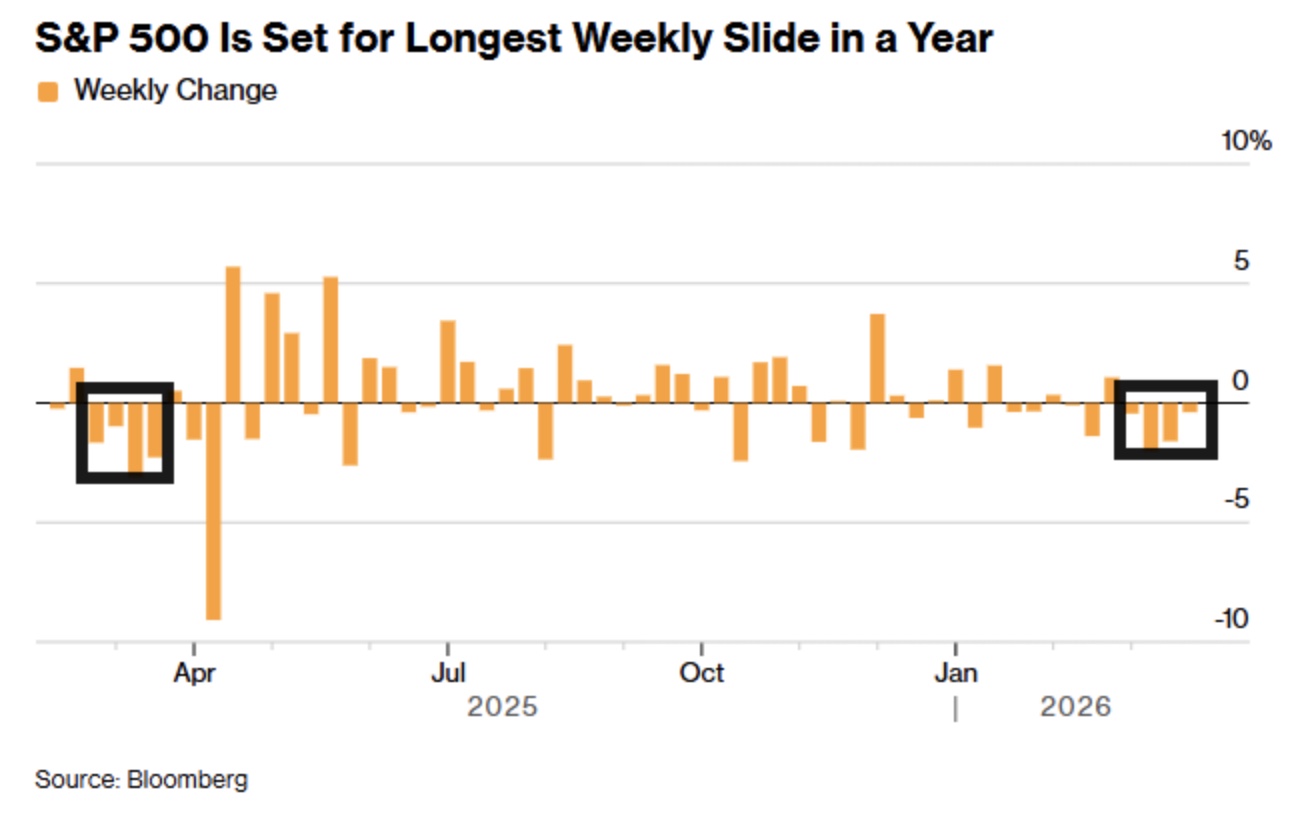 The S&P 500 posted a fourth straight weekly loss, its longest losing streak since last March.