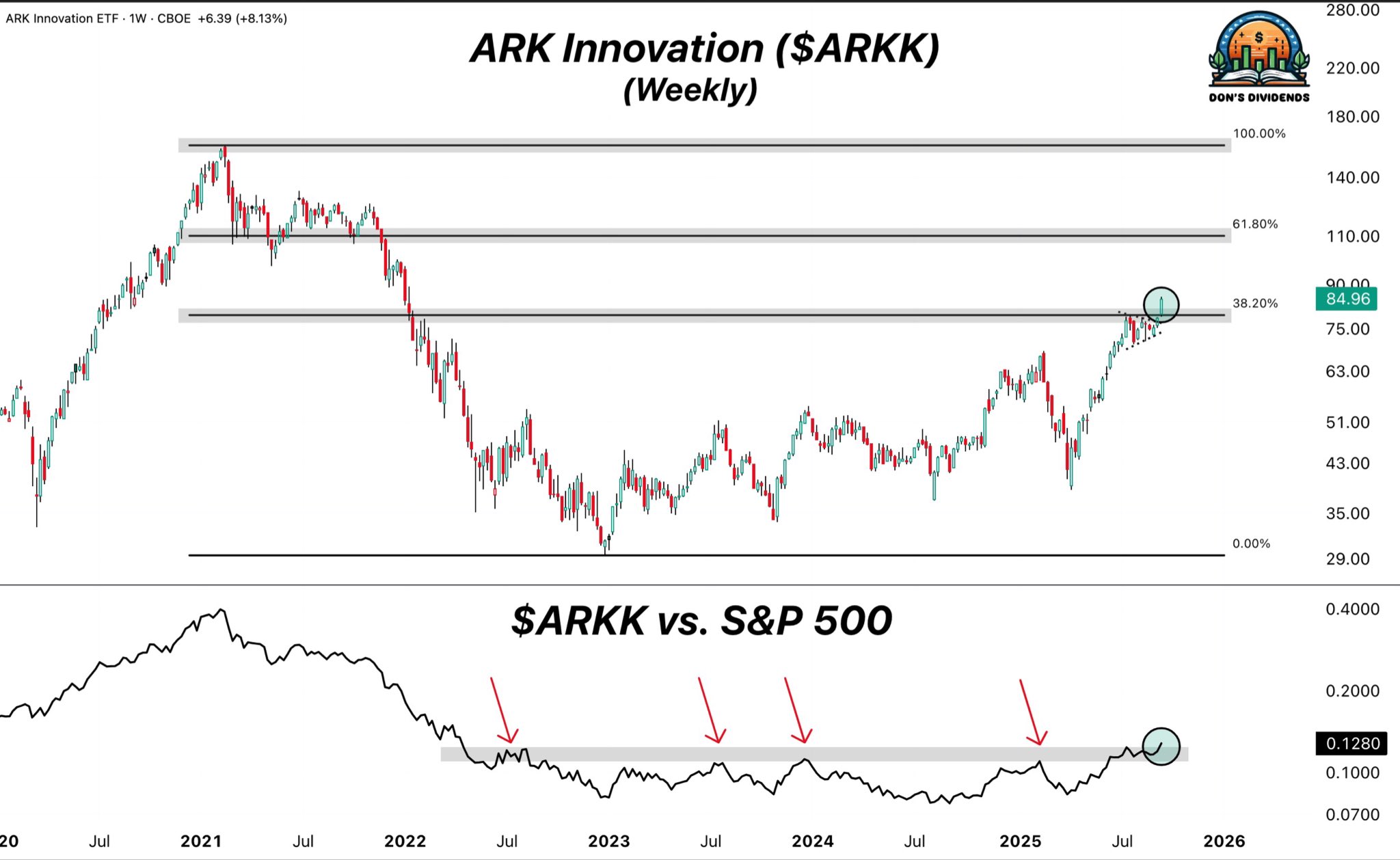 - $ARKK had been consolidating in a tight two-month range below $79, which aligned with the 38.2% Fibonacci retracement of the bear market decline. The next retracement level is near $110, or roughly +30% above current levels.