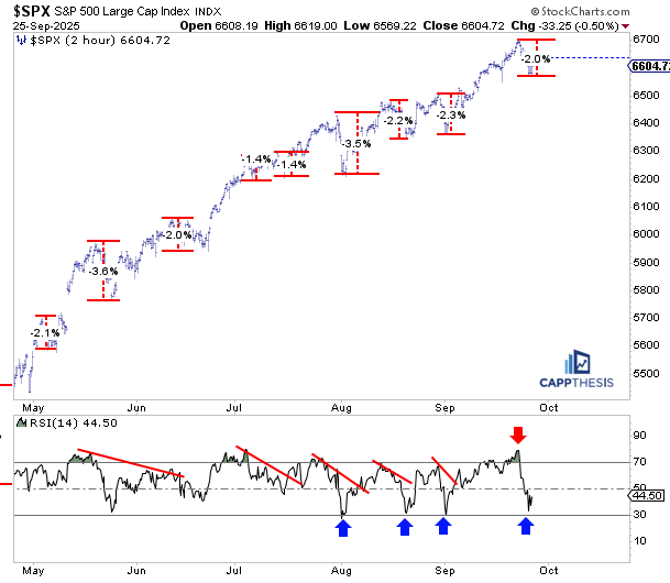 The Takeaway: A -2% decline was all it took for short-term momentum to correct from extremely overbought levels to nearly oversold levels. It avoided oversold territory today, signaling resilience, but immediate follow-through is necessary, and a potential oversold reading would be a red flag.