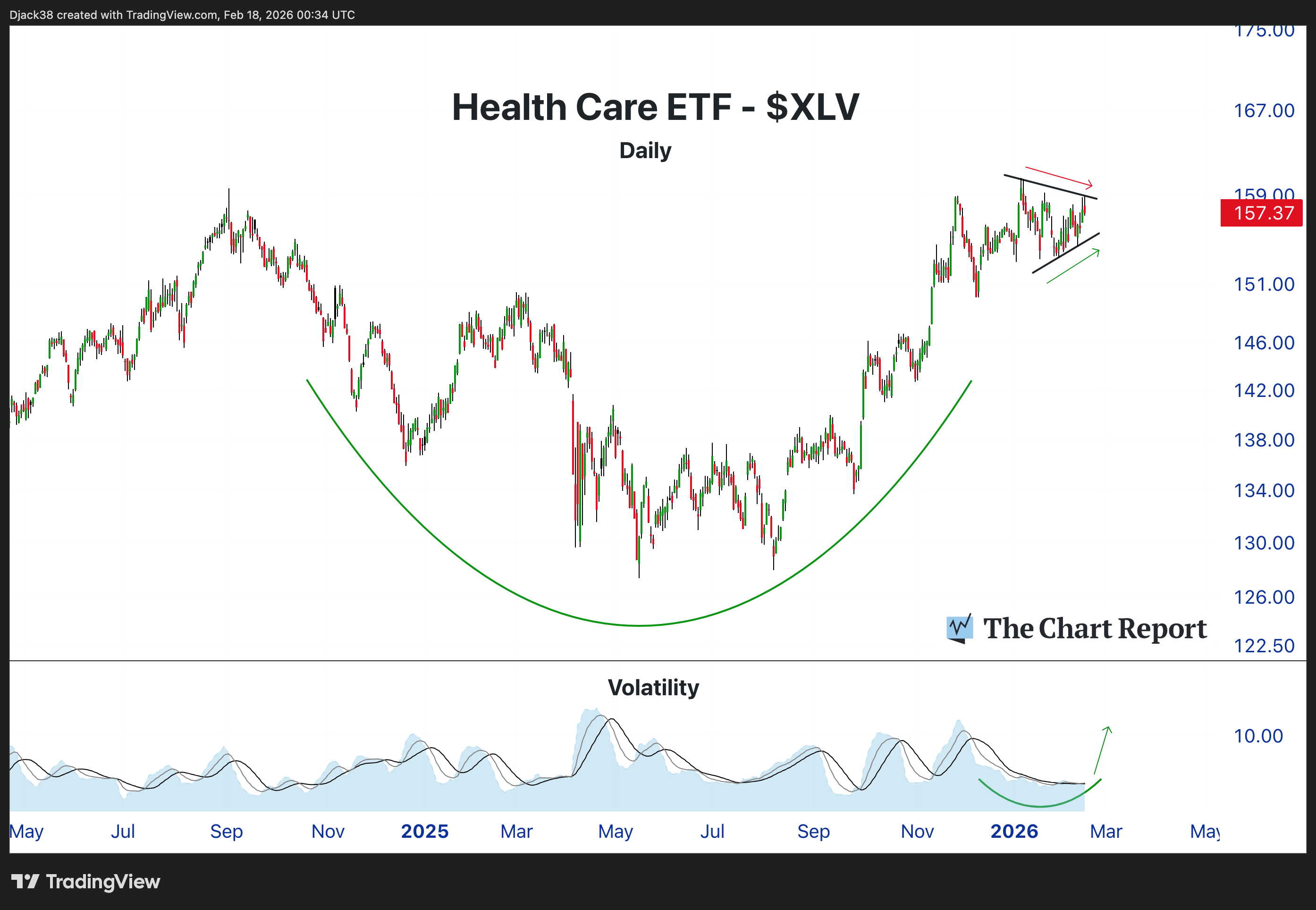 The Health Care ETF ($XLV) is coiling just beneath all-time highs with volatility extremely compressed.