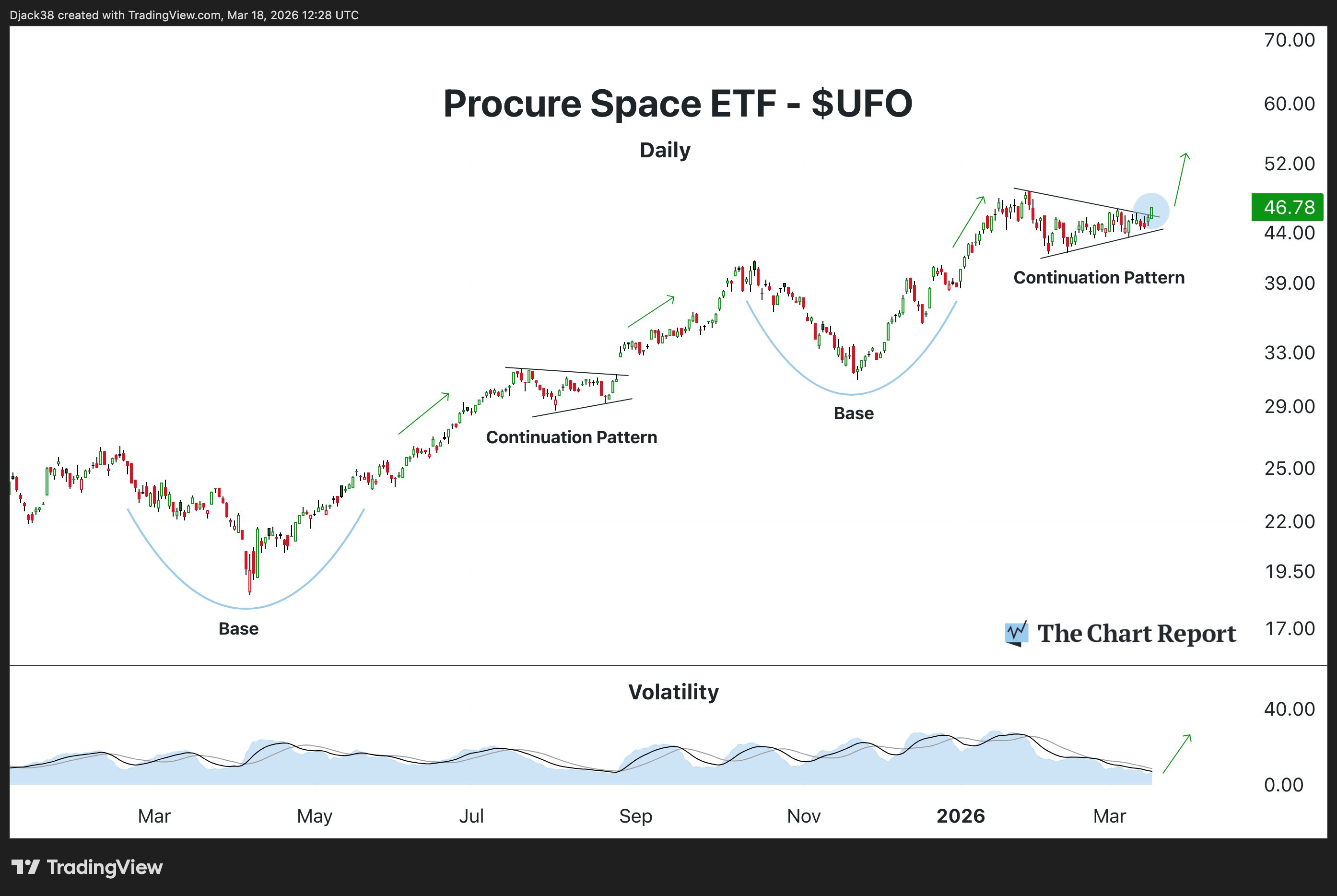 $UFO is now breaking above its downward trendline after digesting the gains from its prior rally.