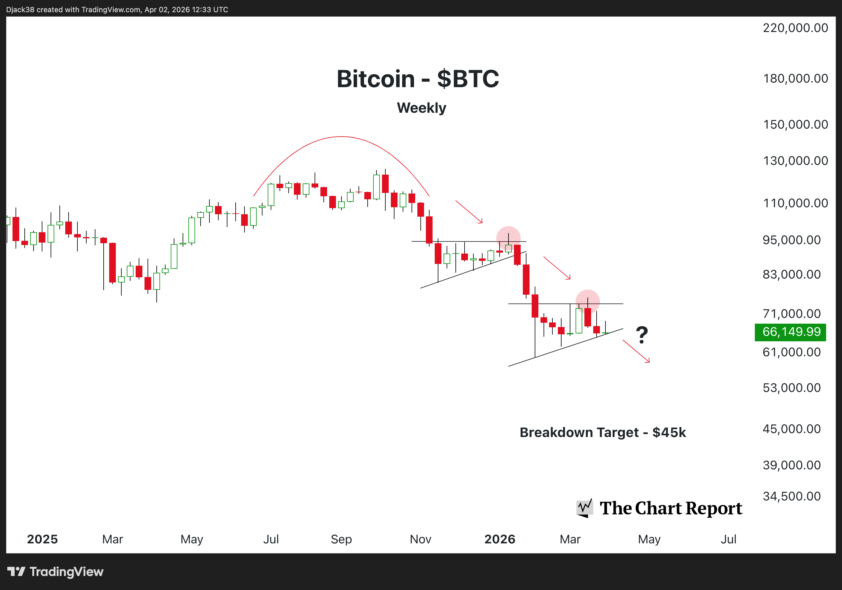 A breakdown of this failed bullish pattern targets roughly $45k, and as we know, from failed moves come fast moves in the opposite direction.