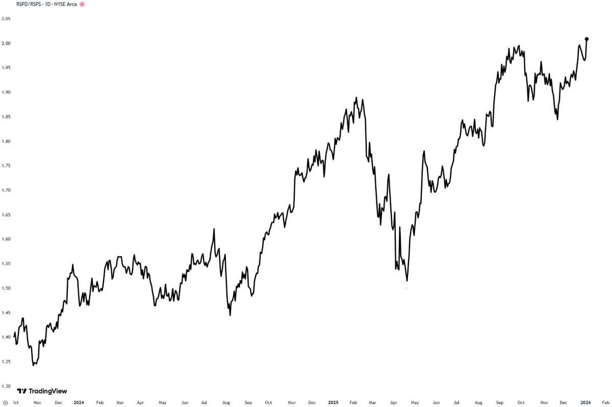 • The equal-weight Consumer Discretionary vs. Staples ratio ($RSPD/$RSPS) pushed to fresh all-time highs today, logging its strongest session in over a month.