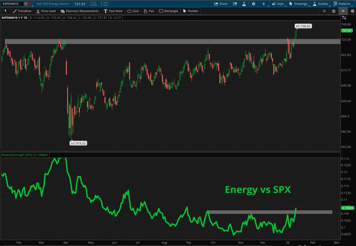 The Takeaway: Energy’s ability to lead on a relative basis while pushing to new highs points to a structurally improving trend, even with long-term resistance still overhead.