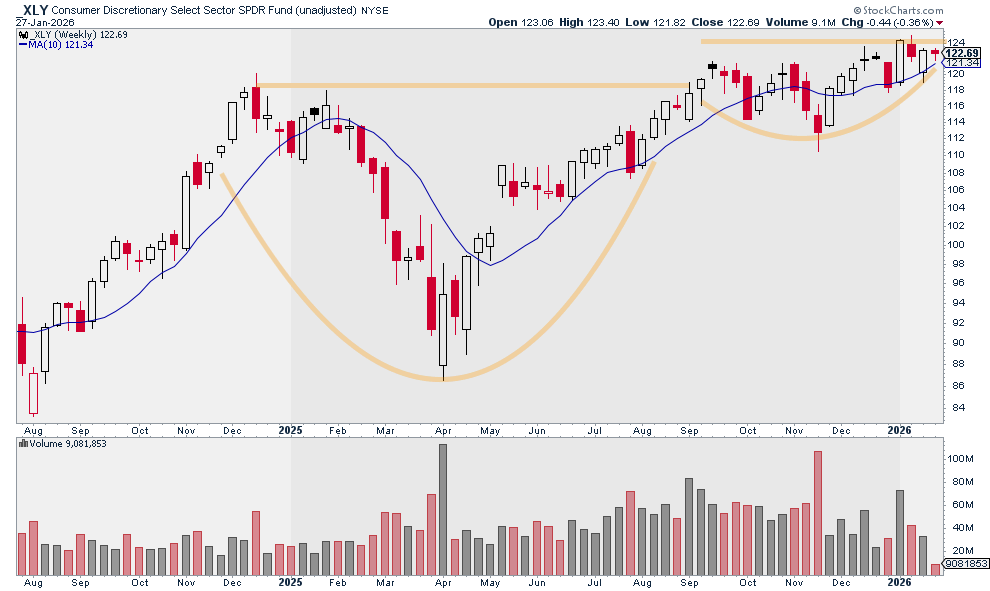 - Consumer Discretionary ($XLY) has spent the last year carving out a potential cup-and-handle base.