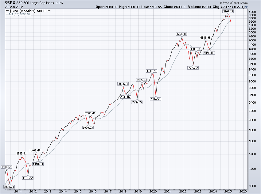 The Takeaway: The S&P 500 could close below its 12-month moving average for the first time since October 2023 unless it rallies +1.4% rally on Monday. While the last sell signal failed, trading below this long-term moving average has historically been associated with painful drawdowns.