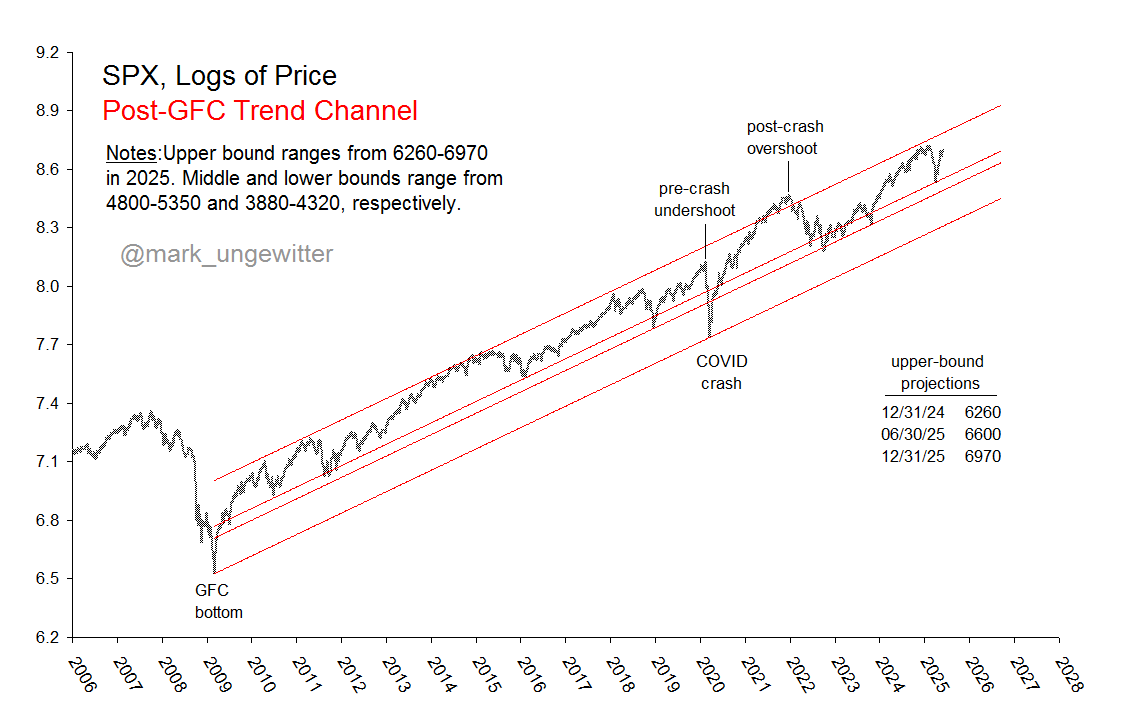 - Mark notes that a projection of the channel’s upper boundary points to a year-end target of nearly 7,000, more precisely 6,970, offering more than +15% potential upside from current levels.