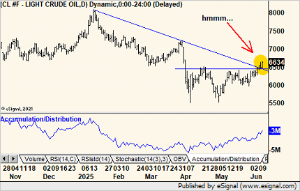 - Michael points out that Crude has breached a potential inflection point at $65, representing the intersection of a 5-month downtrend line and horizontal resistance.