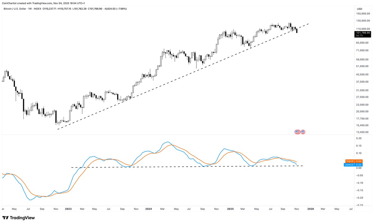 The Takeaway: Bitcoin briefly slipped below six figures today, but more importantly, it violated a three-year trendline that has been in place since the bull market began in late 2022. This doesn't bode well for stocks, considering Bitcoin often leads the broader market higher or lower.