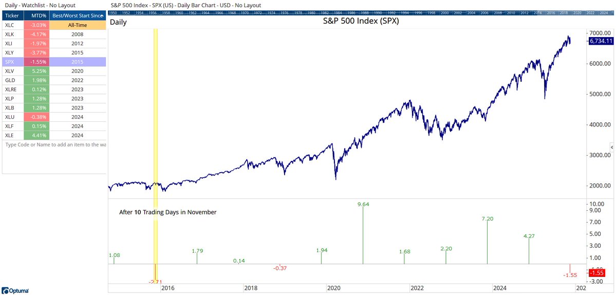 The Takeaway: November has historically been the best month for the S&P 500, but the index is off to its worst start in a decade, down -2.5% so far.