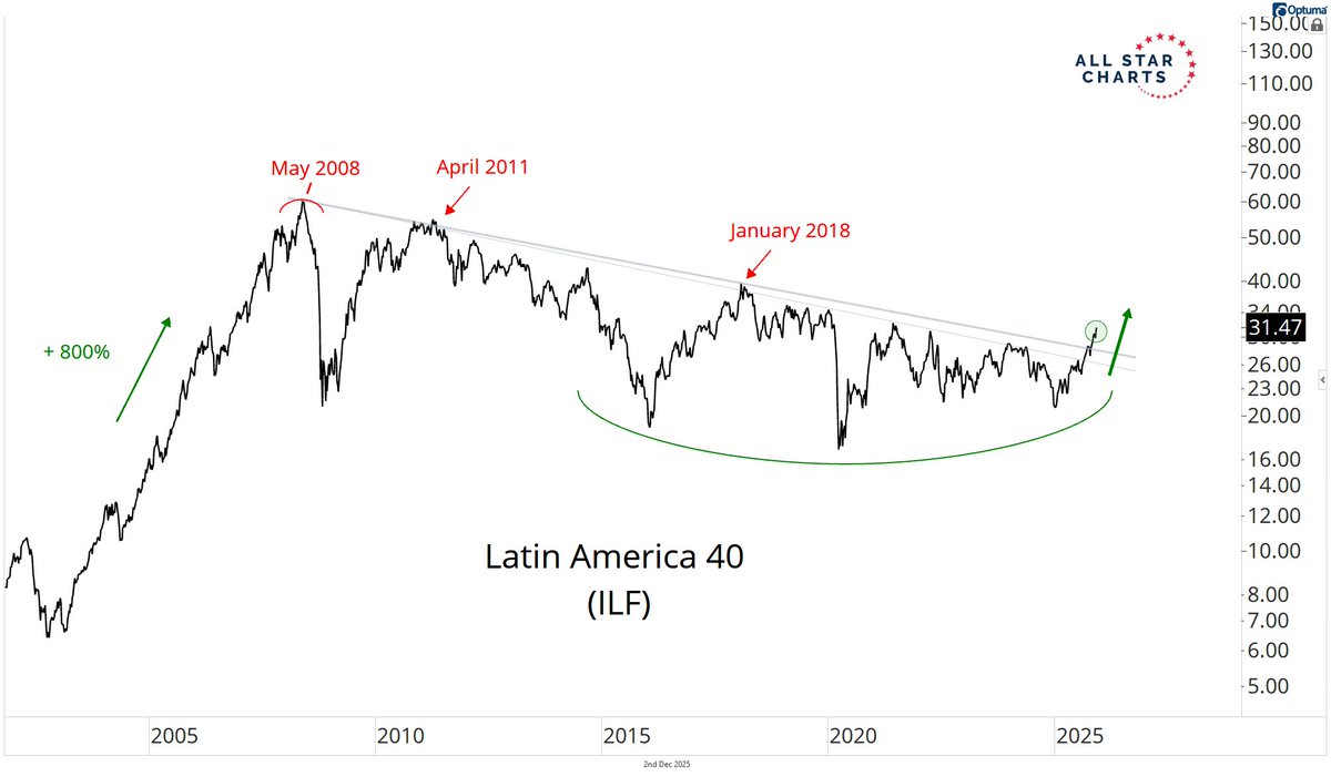- The Latin America ETF ($ILF) closed at a four-year high today and a one-year high relative to the S&P 500. As Rick notes, it's reversing from a 14-year downtrend.